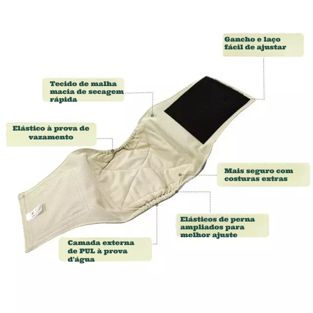 A fralda reutilizável é ideal para absorver vazamentos, mantendo o animal seco e confortável. Também protege o lar contra sujeiras e evita situações constrangedoras com visitas ou em espaços públicos.
