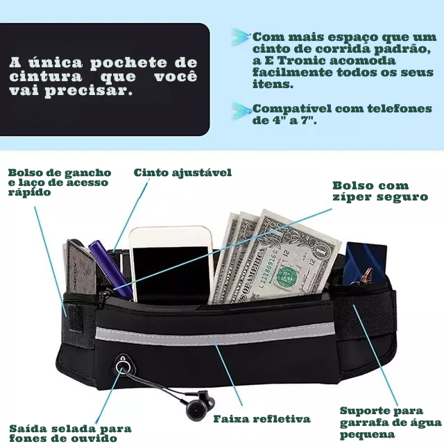O saco de cintura permite carregar tudo no mesmo lugar — prático, acessível e sem peso adicional nos bolsos.
